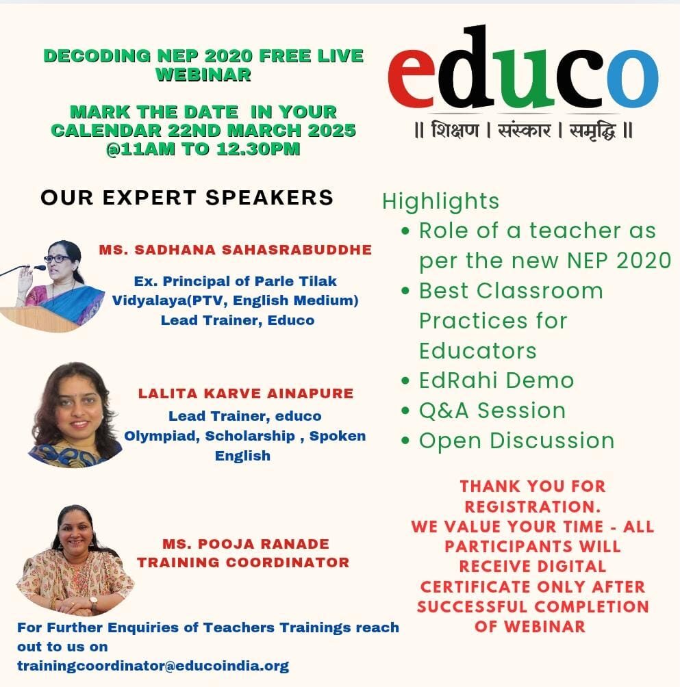 On March 22, PTVEMS (Primary) teachers attended a webinar organised by Educo and EdRahi on “The Role of Teachers in NEP 2020 & Professional Development Strategies.” The session was led by Mrs Sadhana Sahasrabuddhe, the retired Principal of PTVEMS (Secondary), who shared her expertise as the lead trainer.