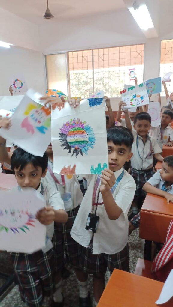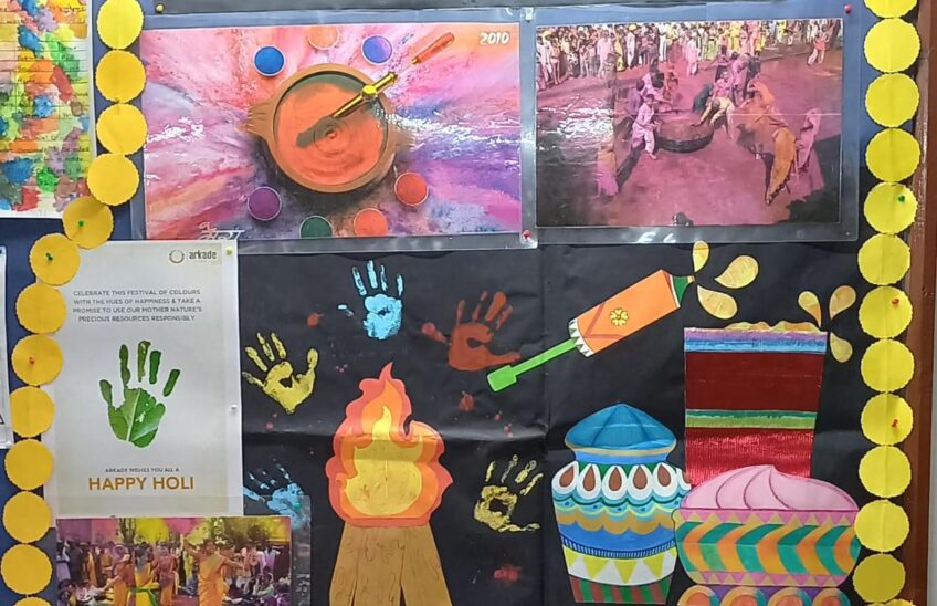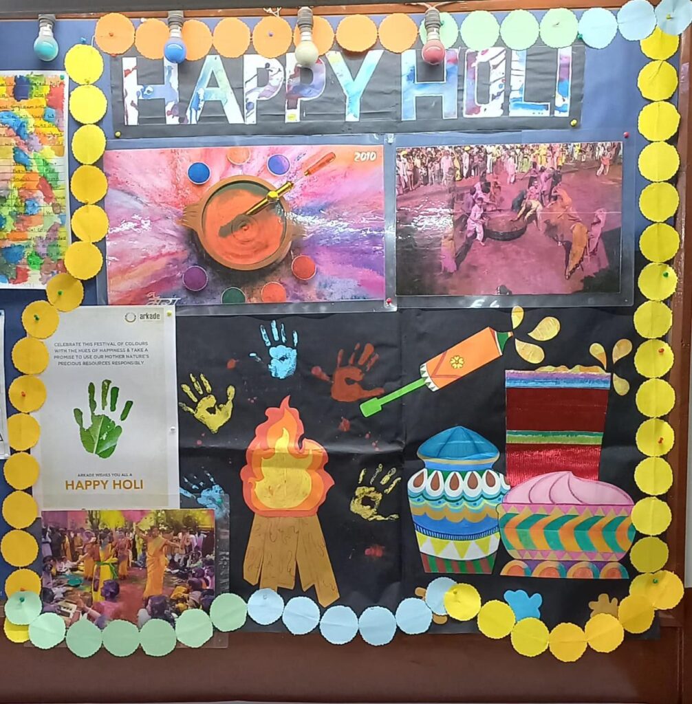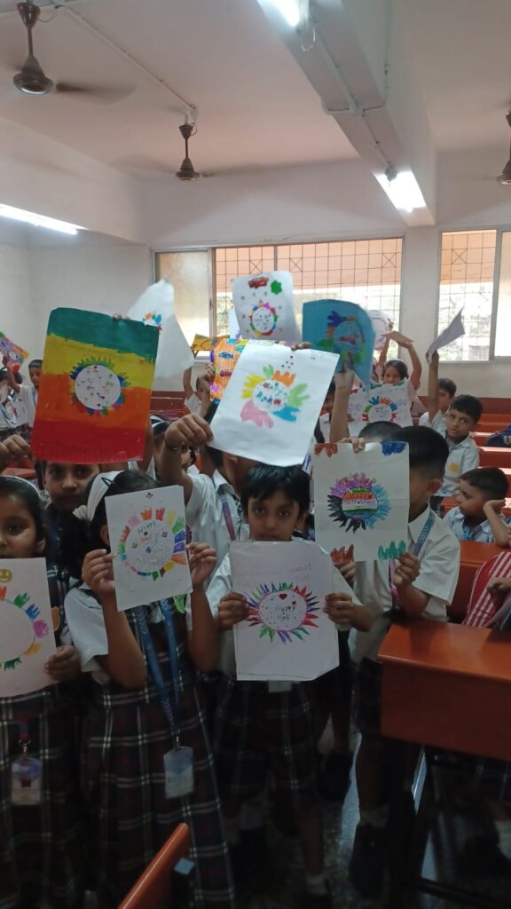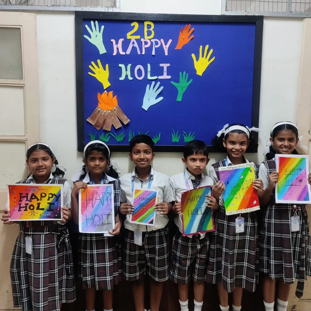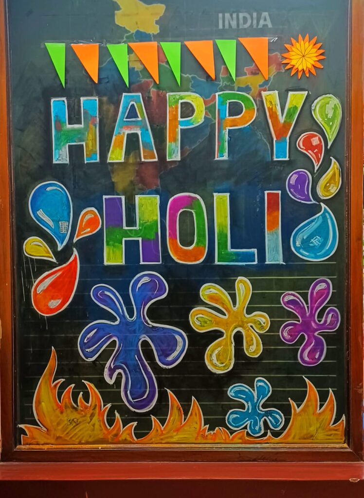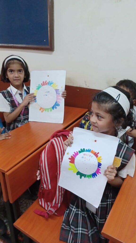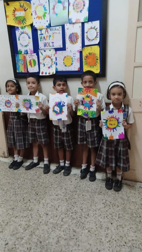 Like all other celebrations held at PTVEMS primary section the festival of *Holi* was celebrated with great excitement but in a different as well as *safe* manner. Children not only played with colours but also created beautiful art pieces out of those. *Holi activity* was conducted for all the students of std 1 to 4. The students were briefed about the importance of this festival and how they should celebrate it in a safe way.The display board was decorated with relevant pictures and beautiful artwork done by our little ones. The teachers too very enthusiastically decorated their own class boards by displaying the art work of the students of their class. The students were engrossed playing with colours in this unique manner and had a memorable Holi celebration.