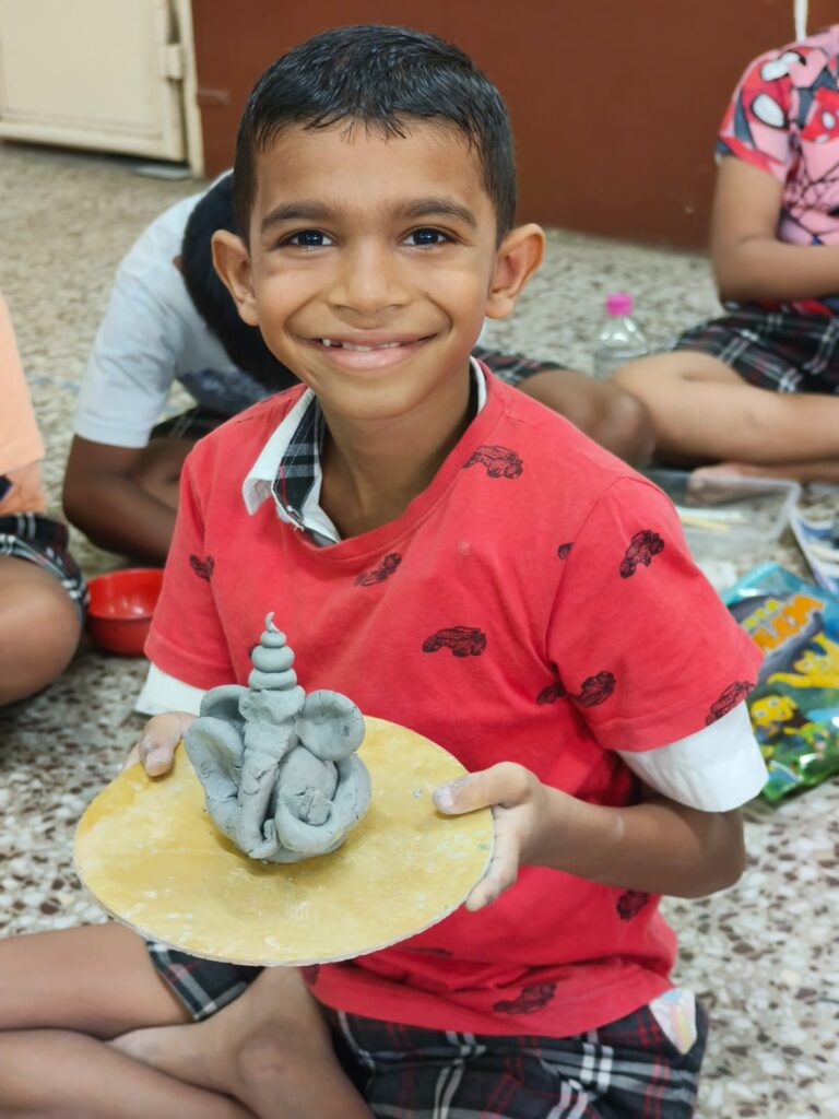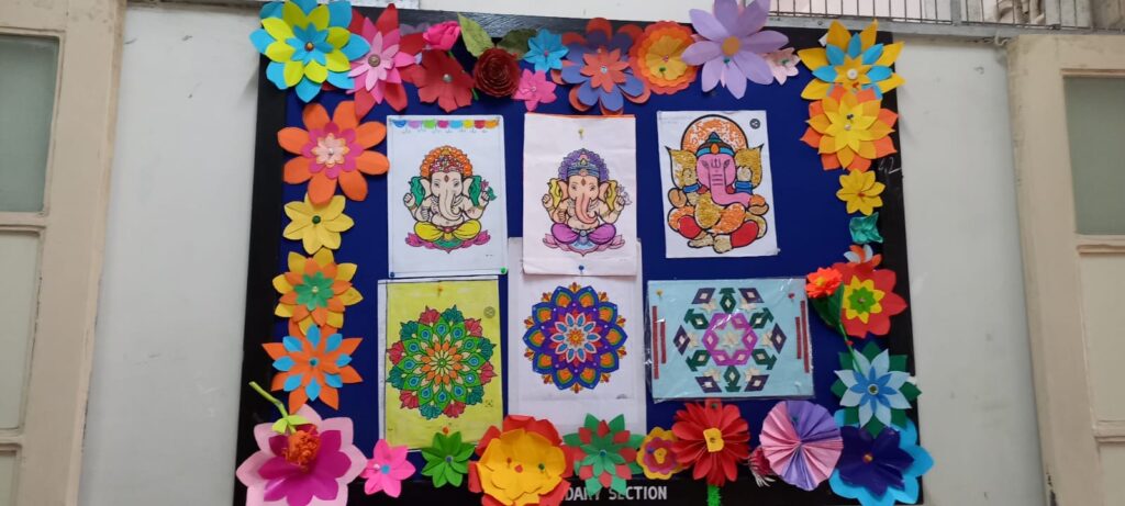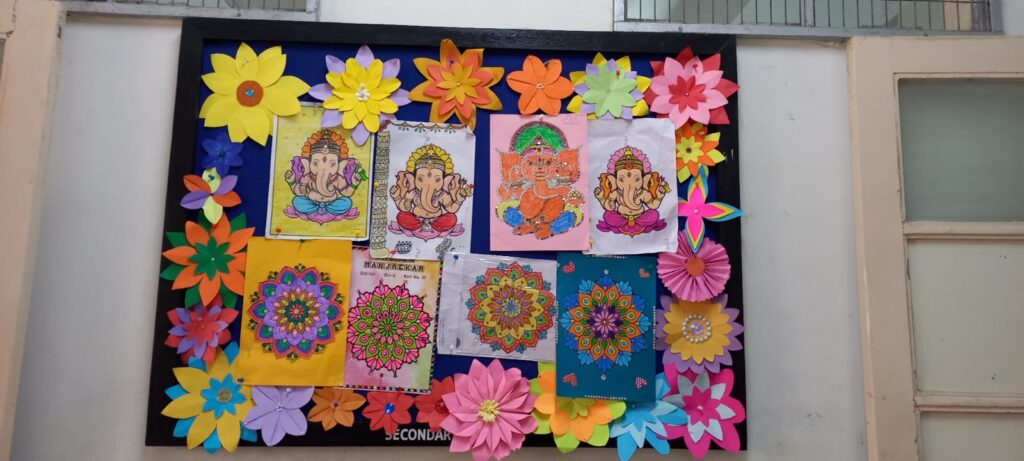 Students of Std 4 made Ganesh idols from ‘shaadu mati’. Students of Std 3 crafted paper flowers. Students of Std 2nd and 1st have coloured and decorated Ganesha’s picture and rangolis respectively.