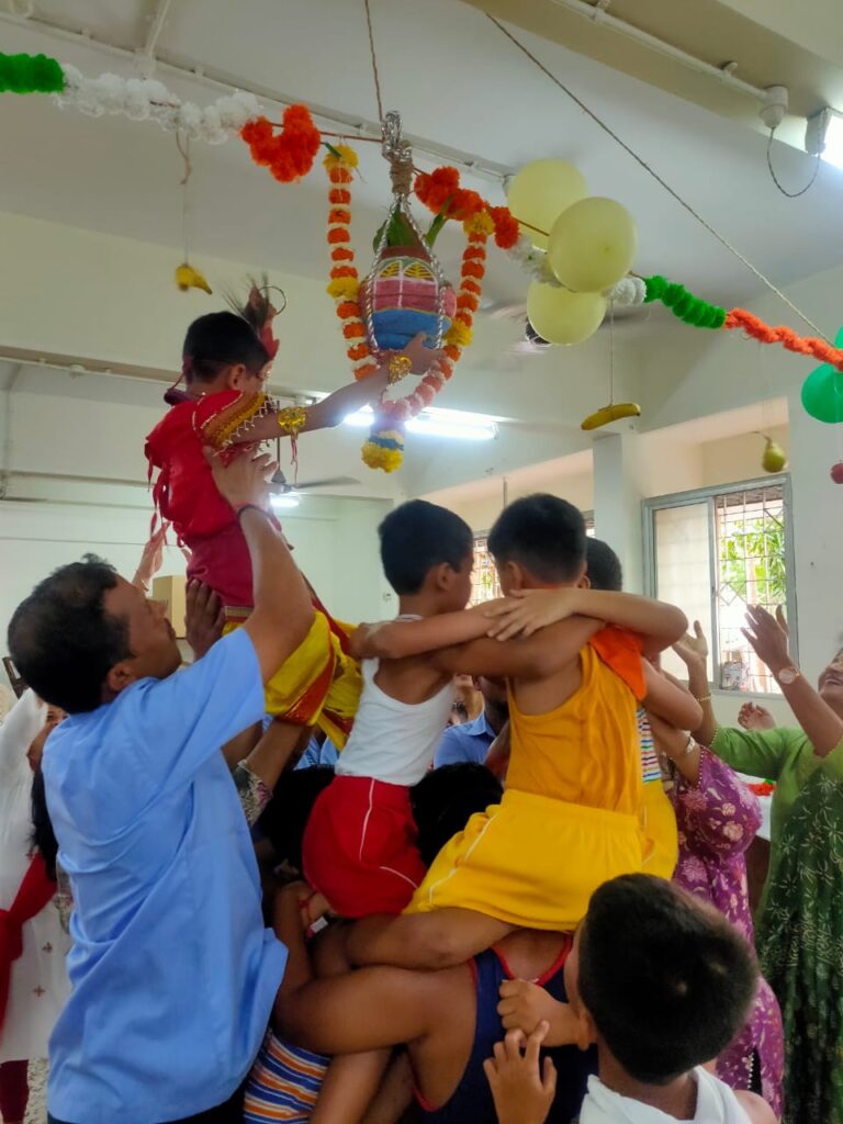 Another major attraction of the Janmashtami celebration was the *Dahi Handi* celebration, where the students formed human pyramid to reach and break the handi, symbolising Krishna’s love for butter. By this way our young talents enthusiastically attempted to break the Dahi Handi showcasing their zeal and unity.