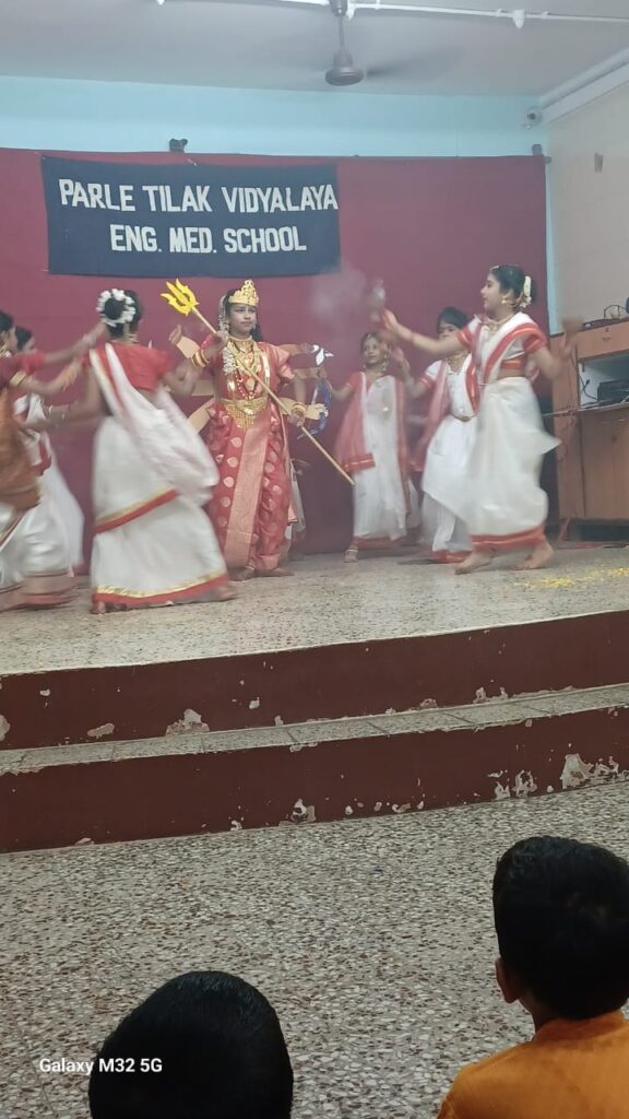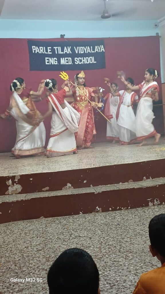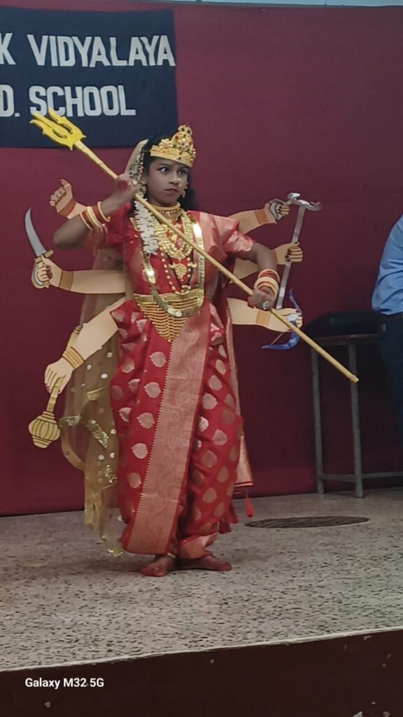 The event was followed with a melodious Saraswati Mata song by our students. The key attraction of the event was the skit enacted by the students of std III and IV based on Goddess Durga’s victory over the demon Mahishasura followed by the dance performance showcasing the nine forms of Goddess Durga. The traditional dance of Bengal ‘ *dhunochi* ‘ was performed by the girls of Std III & IV.