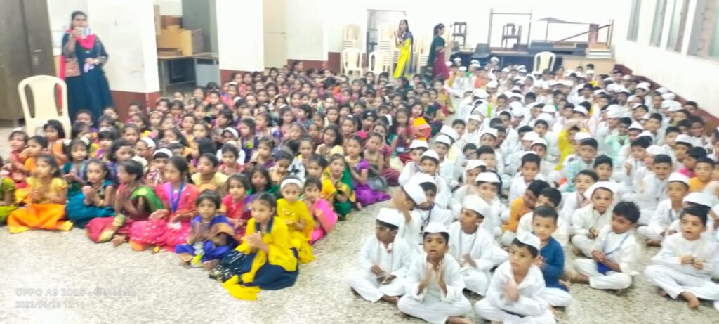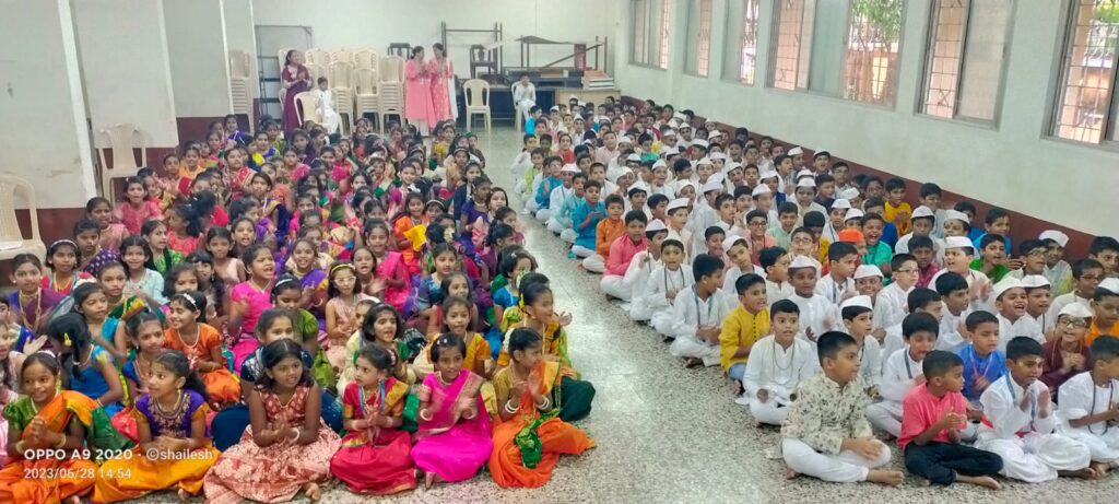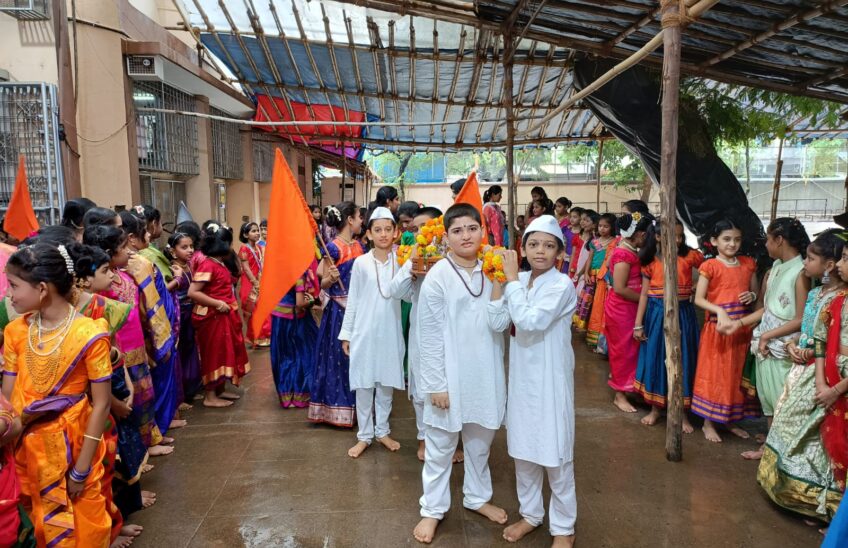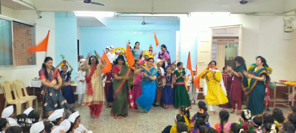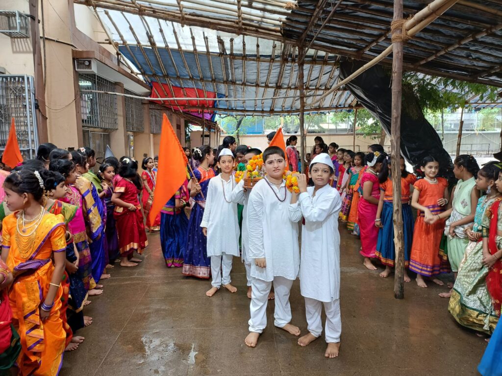 Our headmistress Kalpana Kalekar ma’am offered her prayers by garlanding and seeking blessings of the दिंडी.The दिंडी was carried out in the school premises by the boys and girls of std 4th .