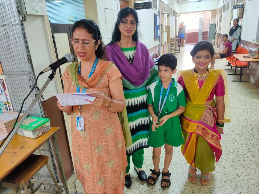 To add a feather to the crown, Hardik Harmalkar from Grade 2 D, sang Hindi song on the festival of ‘Raksha Bandhan’ to express the love of a brother towards his sister.Also,Miss Sanvi Ipte from Grade 4 A, was dressed as a traditional Koli woman and sang a Koli song on the occasion of ‘Narali Pournima ‘ by depicting the importance of pooja performed to the ‘Sea God ‘ and also narrated a few dialogues in typical Koli language by going to all the classes.Students were thrilled listening to her dialogues.