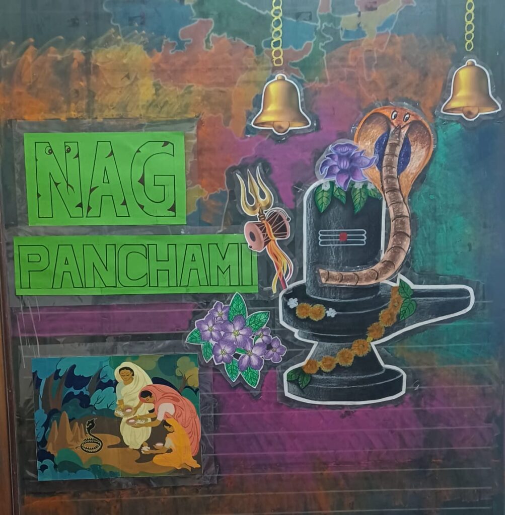 On main display board was displayed with relevant pictures of Naag Panchami by Mrs.Shilpa Jadhav. Our Head mistress Mrs. Kalpana Kalekar and Supervisor Mrs. Sunita Bhagwat offered flowers to *Naag Devta.*
