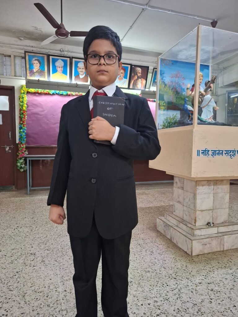 Shardul Kekare (Std. IV C) of PTVEMS (Primary) dressed like Dr Babasaheb Ambedkar recited a poem in Marathi and also sang the following song: