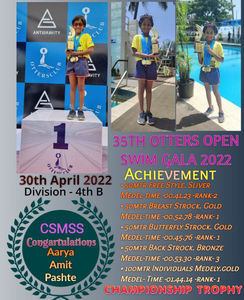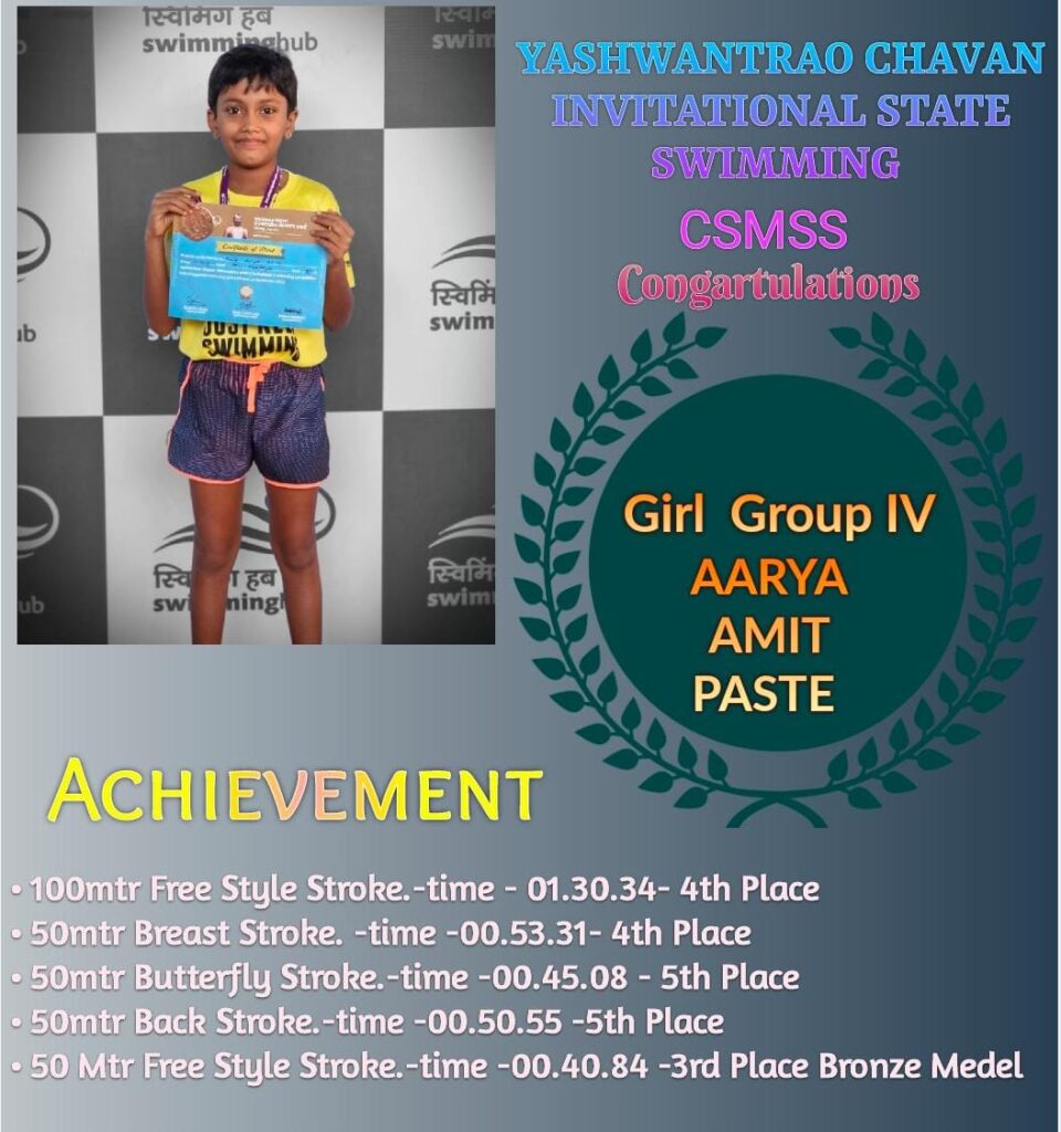 कोल्हापूर येथे १६ ते १८ सप्टेंबर २०२२ या कालावधीत यशवंतराव चव्हाण राज्यस्तरीय जलतरण स्पर्धा आयोजित करण्यात आली होती. या स्पर्धेत पार्ले टिळक विद्यालय इंग्रजी प्राथमिक शाळेत इयत्ता 4/B तुकडीत शिकणाऱ्या कुमारी आर्या अमित पाष्टे या विद्यार्थिनीने कांस्यपदक मिळवले आहे.