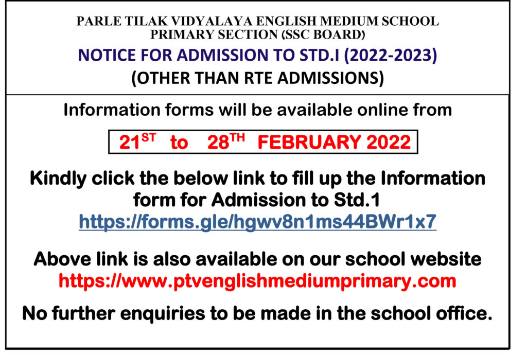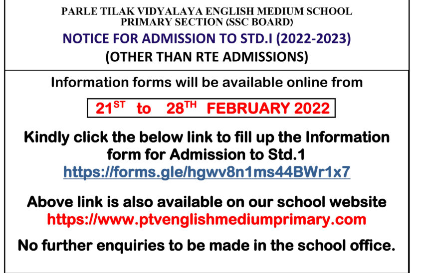 Parents are requested to note that information forms for admission to Std.1 for the academic year 2022-2023 will be available online from 21st to 28 th February 2022