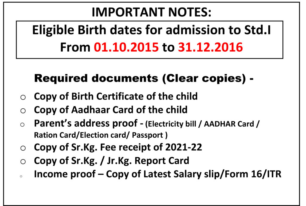 Eligible Birth dates for admission to Std.I From 01.10.2015 to 31.12.2016